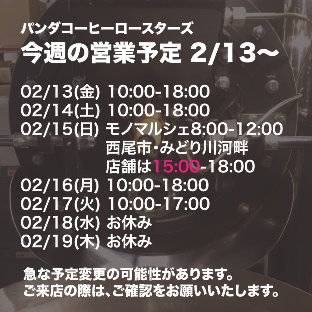 今週の営業予定は、以下の通り。2/15は、モノマルシェに出店いたします。店舗は15時からの時短営業です。