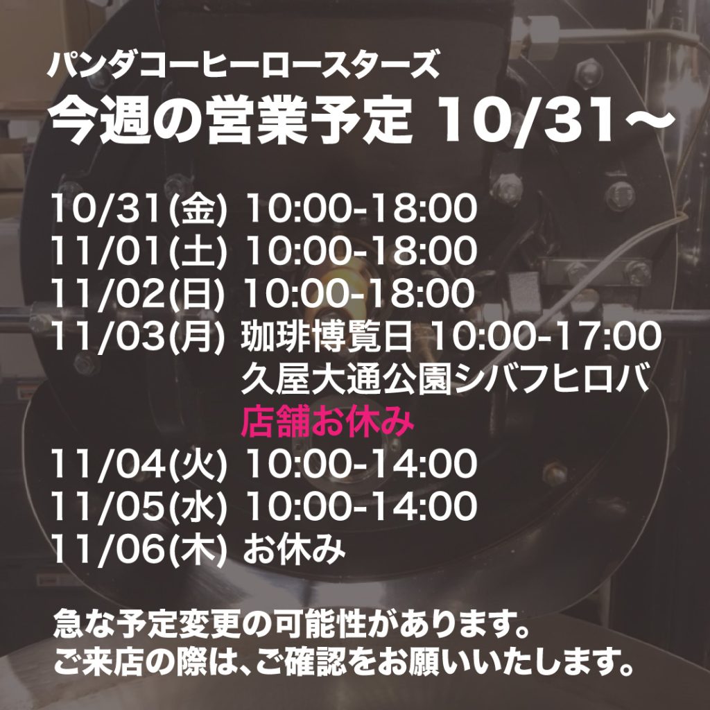 今週の営業予定は、以下の通りです。11/3は、珈琲博覧日(@onedaycoffeeexpo)に出店いたします。