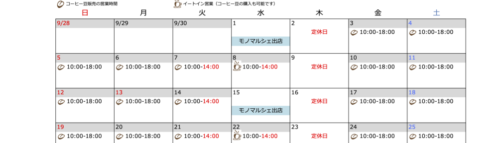 10月の営業カレンダーです。