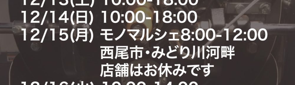 今週の営業予定は、以下の通りです。12/15は、今年最後のモノマルシェです。