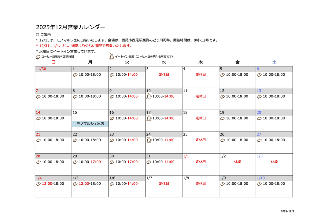 12月の営業カレンダーです。1月第1週も含んでいます。