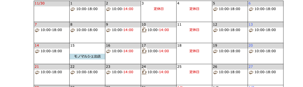 12月の営業カレンダーです。1月第1週も含んでいます。