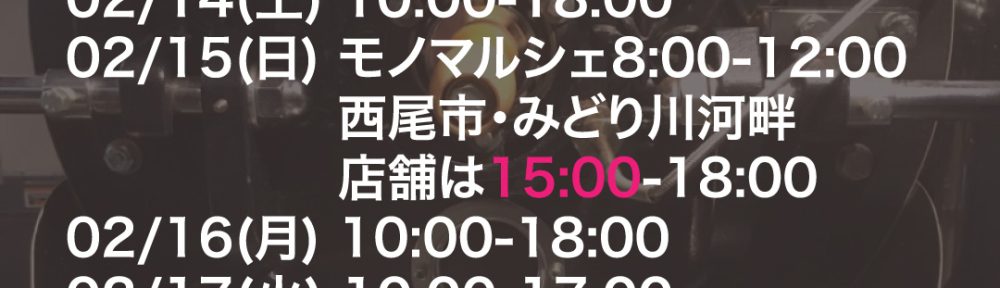 今週の営業予定は、以下の通り。2/15は、モノマルシェに出店いたします。店舗は15時からの時短営業です。